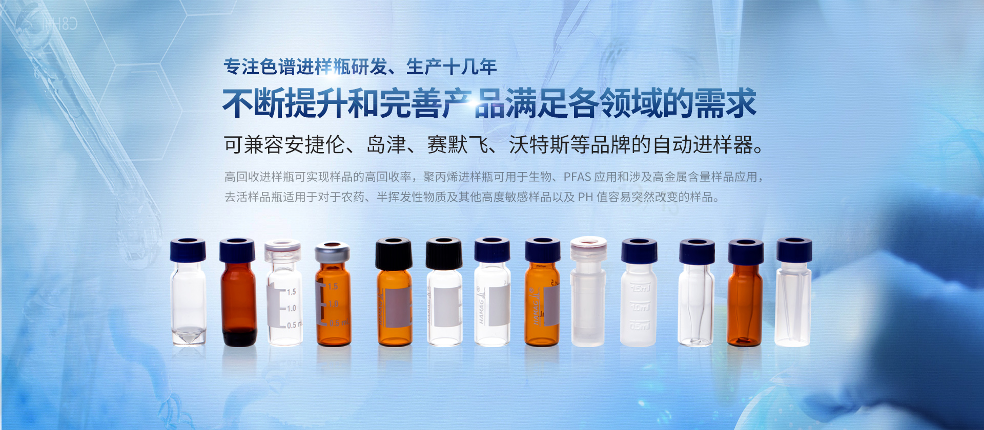 浙江哈邁科技有限公司(簡(jiǎn)稱HAMAG),成立于2005年,總部位于美麗的海濱城市寧波,是中國(guó)優(yōu)質(zhì)色譜進(jìn)樣瓶、樣品瓶供應(yīng)商,是一家專業(yè)從事色譜耗材的科研、設(shè)計(jì)、生產(chǎn)、銷售和系統(tǒng)集成為一體的生產(chǎn)型企業(yè)。經(jīng)過十幾年的研發(fā)與努力,通過和國(guó)內(nèi)外多個(gè)科研部門,浙江大學(xué)理工學(xué)院,同時(shí)與品牌:安捷倫、沃特世、島津等公司的技術(shù)交流與學(xué)習(xí),我們成功的研制開發(fā)出實(shí)驗(yàn)室分析設(shè)備專用的各種型號(hào)的自動(dòng)進(jìn)樣瓶、頂空瓶及其配套蓋墊;特氟龍與硅膠復(fù)合墊片;特氟龍/硅膠制品;創(chuàng)新型固相萃取儀;針式過濾器等幾十種實(shí)驗(yàn)室耗材及關(guān)聯(lián)產(chǎn)品...